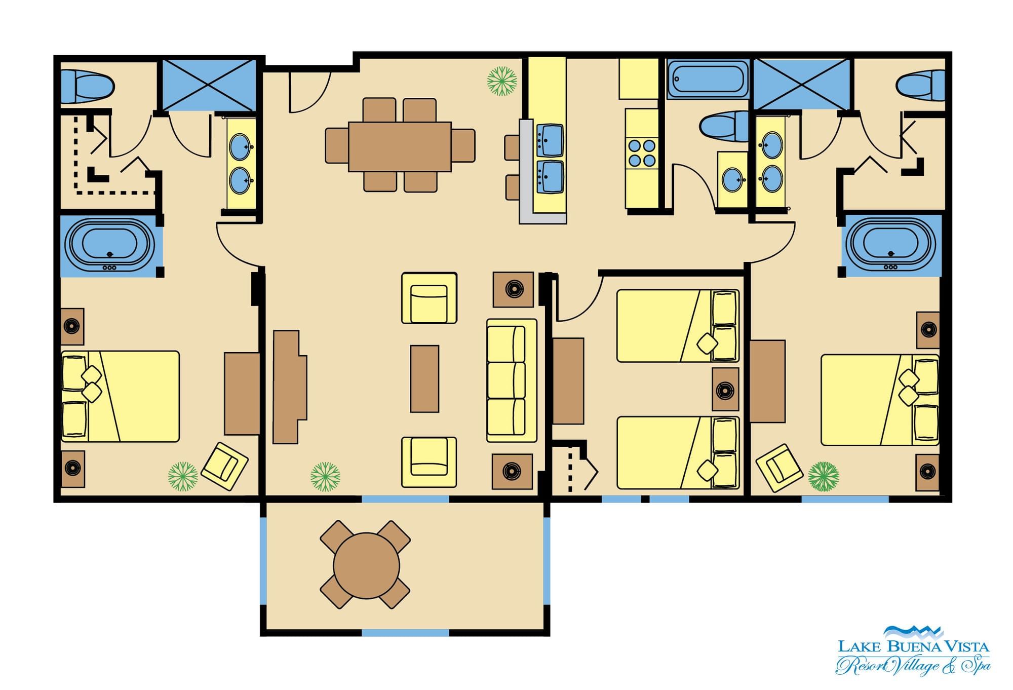 The primary bedroom includes a king bed, wall-mounted 50-inch flat-screen TV, walk-in closet, and a spa-inspired bathroom with upgraded amenities, a jetted tub, and separate shower. The second bedroom offers two double beds, a wall-mounted 50-inch TV and a second bath located in the hallway with a tub/shower combination. The third bedroom is another primary bedroom featuring a king size bed and 50-inch TV plus, a third bath with jetted tub and seperate shower. Elevate your Orlando getaway with the comfort and exclusivity of the LBV Signature Collection Suites.